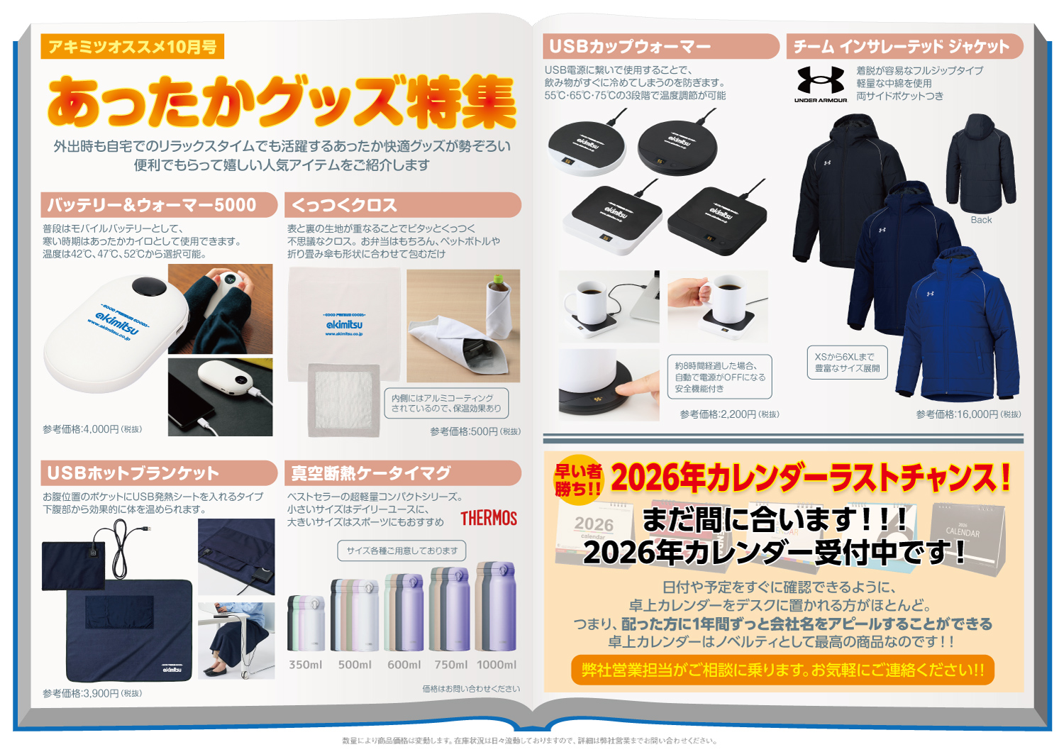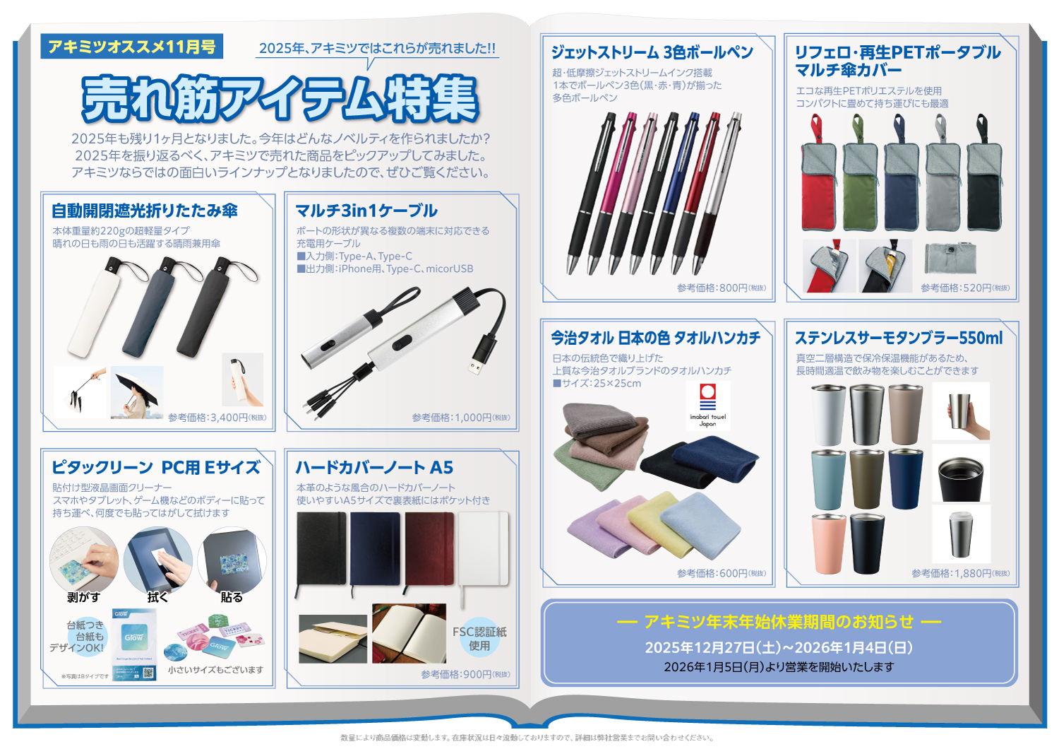 2025年を振り返るべく、アキミツで今年売れた商品をピックアップしてみました。どの商品も季節を問わず、1年中ご愛用いただけるものばかりですので、ぜひ来年のノベルティ制作の参考にしてみてください。